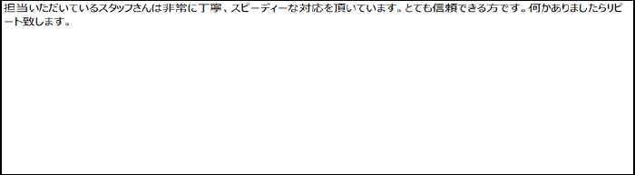 担当いただいているスタッフさんは、非常に丁寧、スピーディーな対応をいただいています。とても信頼できる方です。