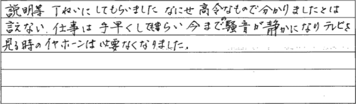 なにせ高齢なもので、分かりましたとは言えない仕事は手早くしてもらい、今までの騒音が静かになり、テレビを見る時のイヤホンは必要なくなりました。