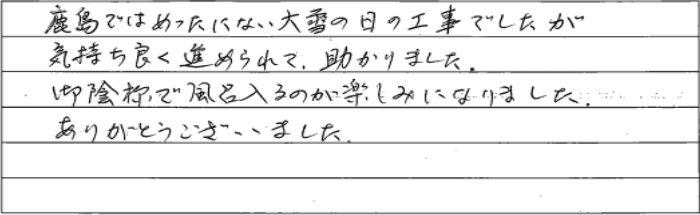 鹿島ではめったにない大雪の日の工事でしたが、気持ち良く進められて助かりました。