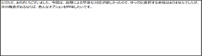 今回は、故障による早急な対応が欲しかったので、ゆっくりと選択する余裕はありませんでしたが、次の機会があるならば、色んなオプションを吟味したいです。